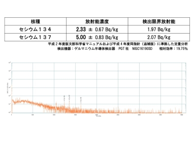 大明神の6月分は、測定時間を20時間に統一していたので不検出となりました。しかし、継続測定では月ごとの数値を比較するために、あらためて39時間の長時間測定を行ないました。その結果6月は1.64 Bq/kg、 7月は2.75 Bq/kg、8月は2.62 Bq/kgと放射性セシウムがすべての月で確認できました。