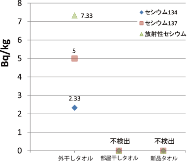 11月9日にゲルマニウム半導体測定器で測定した結果、セシウム137は2.90 Bq/kg、セシウム134は1.94 Bq/kgを検出しました。合算した放射性セシウムの値は4.84 Bq/kgとなりましたが、これは1 kgあたりの放射能量を表しています。タオル1枚あたりでみると、1枚の重さが50 gなので0.24 Bqの放射性セシウムが付着していたと考えられます。