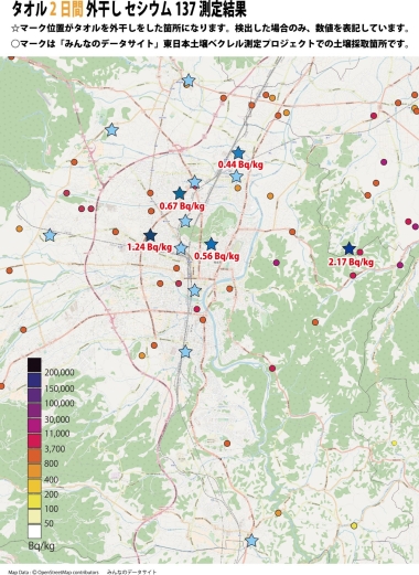 外干しタオルからは、放射性セシウムを7.33 Bq/kg検出しました。しかし、タオルを干した時間は笹谷の倍の48時間になること、また、季節が違うこともあり数値の単純比較はできません。ただし、この地域は他に比べ比較的空間線量率が高く、土壌に沈着した放射性セシウムの量も多いことから、干した時間を同じにしても数値が高くなった可能性はあります。